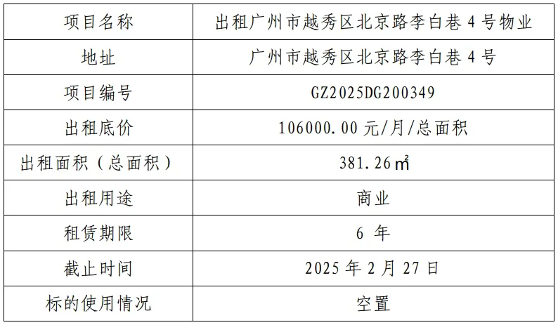 广州市越秀区北京路李白巷4号出租项目已在广州产权交易所进行公开挂牌(http://gzfc.gemas.com.cn/fang/detail.shtml?2ef7203ca5c74fbd8e8dc0fb7ea7362a),挂牌时间为2025-02-14至2025-02-27,点击本文末尾左下角“阅读原文”查看项目挂牌页面,期待您的参与。